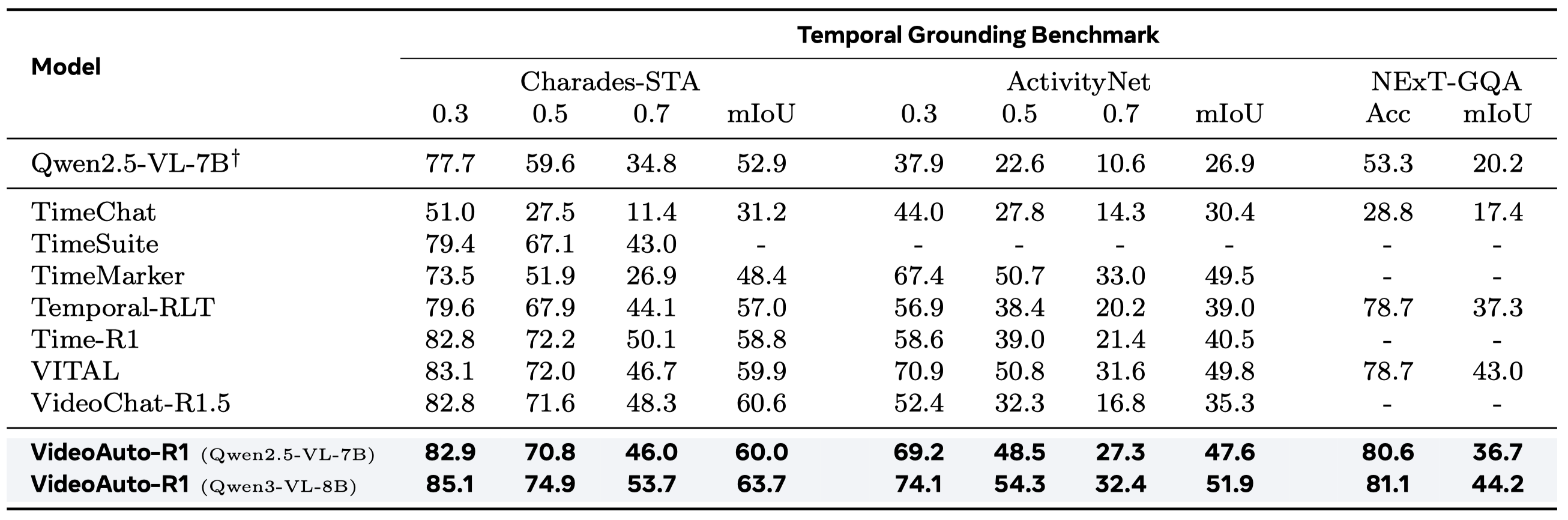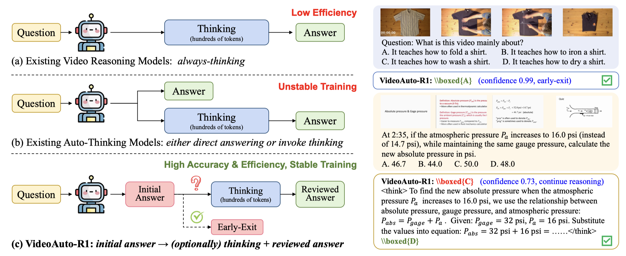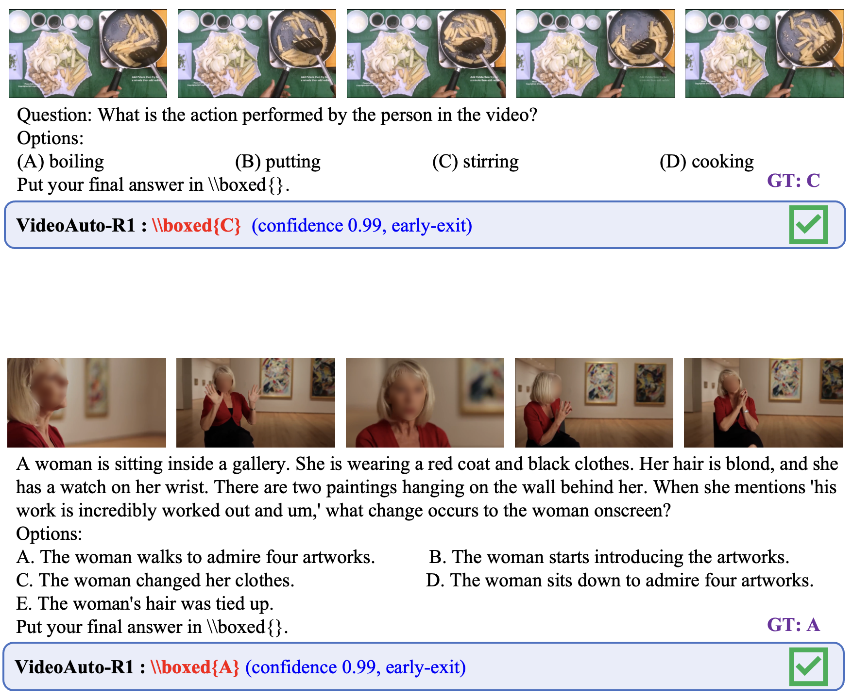 Across video QA and grounding benchmarks, VideoAuto-R1 achieves state-of-the-art accuracy with significantly improved efficiency, reducing the average response length by ∼3.3x, e.g., from 144 to just 44 tokens. Moreover, we observe a low rate of thinking-mode activation on perception-oriented tasks, but a higher rate on reasoning-intensive tasks. This suggests that explicit language-based reasoning is generally beneficial but not always necessary.